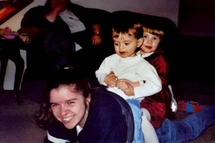 Daniel and Addison bouncing on Lindsey's back
