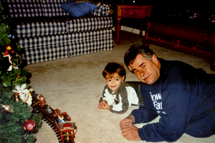Gene and Daniel playing with the train around the Christmas tree