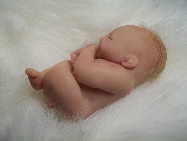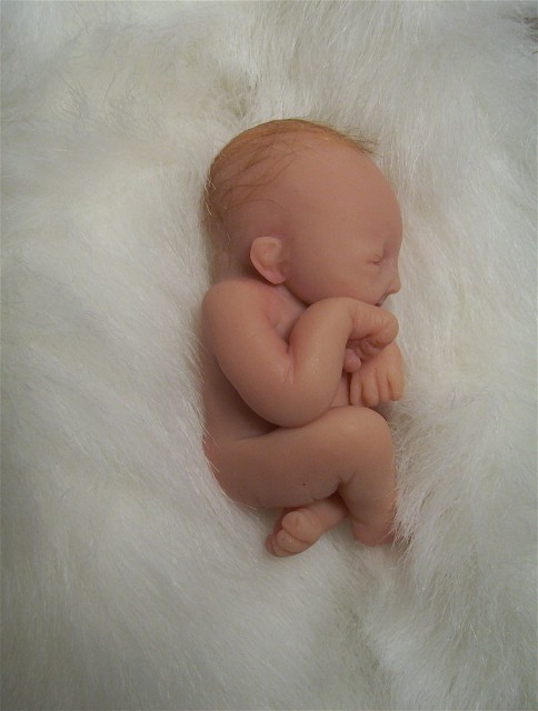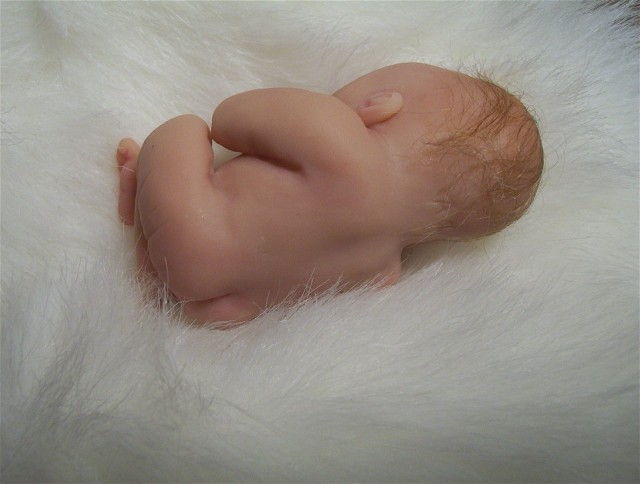 She was hand sculpted by me out of Prosculpt Polymer clay - no molds used of any kind. Angel has hand applied wavy light brown premium mohair, very whispy and light just like a newborn. She has been delicately blushed in all appropriate areas to give her skin a natural tone.