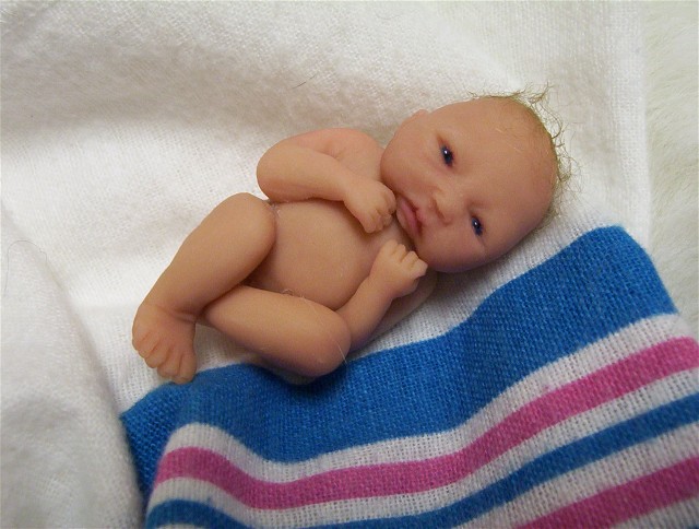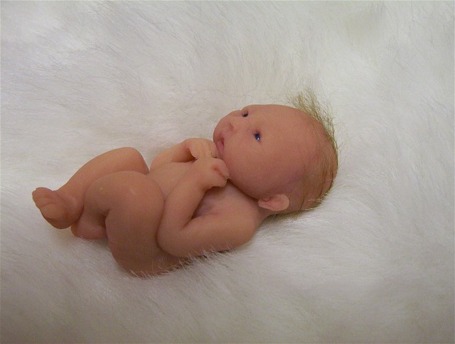 She was hand sculpted by me out of Polymer clay - no molds used of any kind. Maisy has hand applied wavy light brown premium mohair, very whispy and light just like a newborn. Her big blue eyes are made of glass and look incredibly lifelike. She has been delicately blushed in all appropriate areas to give her skin a natural tone.