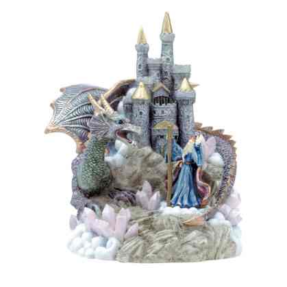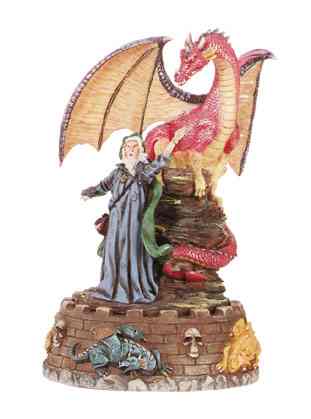 With his castle protected by a fierce dragon, Merlin surveys his domain on this distinctive musical sculpture. 5" x 5" x 7" high. #30764 $20.00