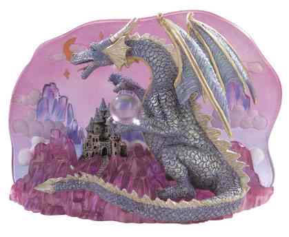 An entire scene unto itself, this dragon. With his crystalline ball, overlooks a castle in the clouds under a starry sky. 7 1/4" x 4 3/4" x 6 1/2" high. #31401 $20.00