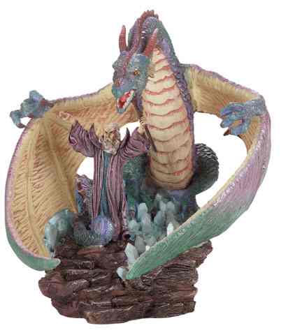 From a rocky outcrop on a crystalline "sea" Merlin uses his skull-topped staff to battle a dragon. 9 1/2" x 6 1/2" x 7" high. #31706 $20.00