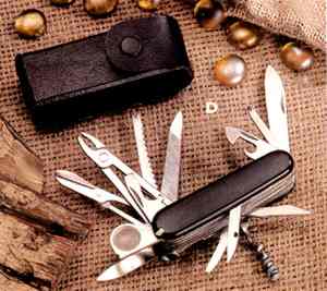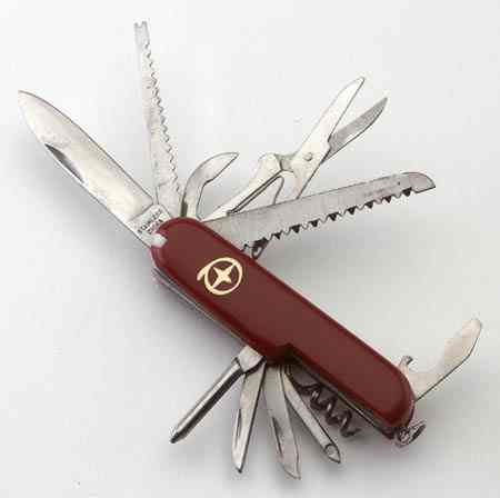 Swiss Army Knife. 11 functions including: 3 blades, corkscrew, saw, screwdriver, and more. 3 1/2" closed. Longest blade 2 1/2" #8874 $15.00