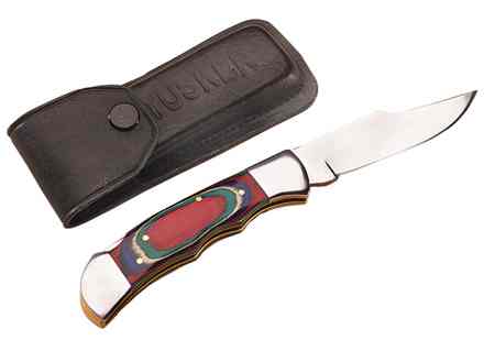 This double-bladed pocket knife with multi-color wooden handle contains 2 stainless steel blades and is accompanied by a black leather sheath. 2 1/2" blades. #30021 $10.00