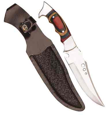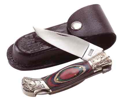 A gracefully curved, stainless steel blade and multi-colored wood handle join together to form a unique collector's knife. With leather sheath. 5 1/2" blade. #30040 $15.00