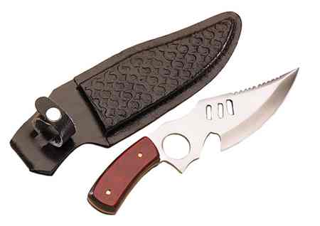 Reliable hunting knife features durable 4mm stainless steel blade. Molded comfort-grip handle with etched chrome floral pattern. Includes belt-loop leather sheath. 10 1/2" long, 5 1/2" blade. #22051 $15.00