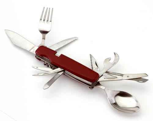 Camping companion! Knife, fork, spoon, corkscrew, awl, file, canvas needle, can/bottle opener, saw and fish scaler. Longest blade 3 1/4" #3565 $15.00