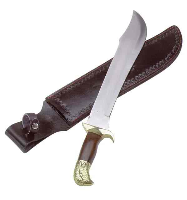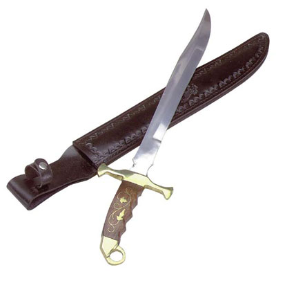 A must for sword collectors, this sensational example of exquisite craftmanship features a stainless steel blade, brass inlay bolster and wooden handle with brass guard. Comes with leather sheath, 19 1/2" long, 13 3/4" blade. #29358 $25.00