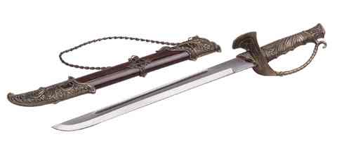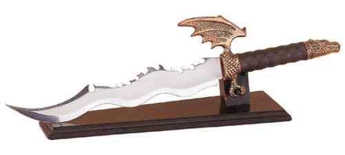 The sensational design of this dragon sword mirrors the undulating shape of the beast for which it was named. A dazzling piece for the serious collector. Black wooden display stand included. 21 3/4" long, 14" blade. #30053 $35.00