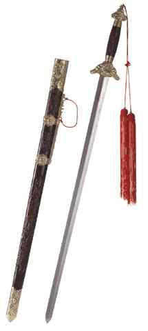 A traditional Chinese sword, this example features a 40" stainless steel engraved blade, a wood case and handle with metal decoration and tassel. #31236 $30.00