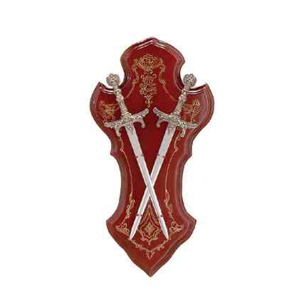 Displayed on a wooden stand which is intricately hand-painted, these swords are evocative of the medieval era. 7 3/4" x 1/2" x 15" long. #31746 $15.00