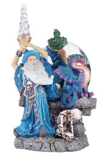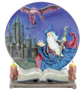 A musical Merlin looms magically out of an enchanted castle in this sensational water globe. The castle is crafted in elaborated detail, accented with colorful "jewels". 6" x 6 1/2" x 6 3/4" #24777 $25.00
