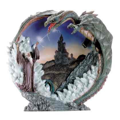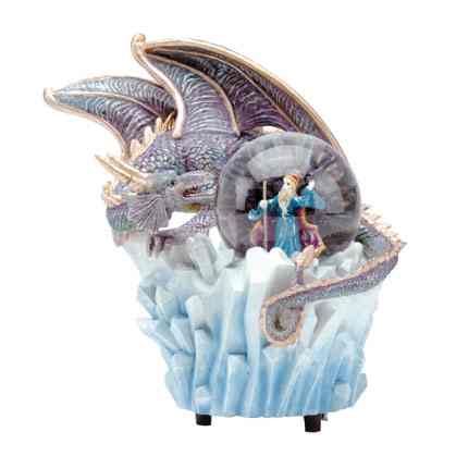 A fierce dragon encircles a "crystal" ball, conjuring up the image of Merlin the magician. A unique musical water globe. 7 1/2" x 6" x 6 1/4" high. #30765 $20.00