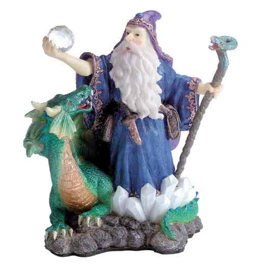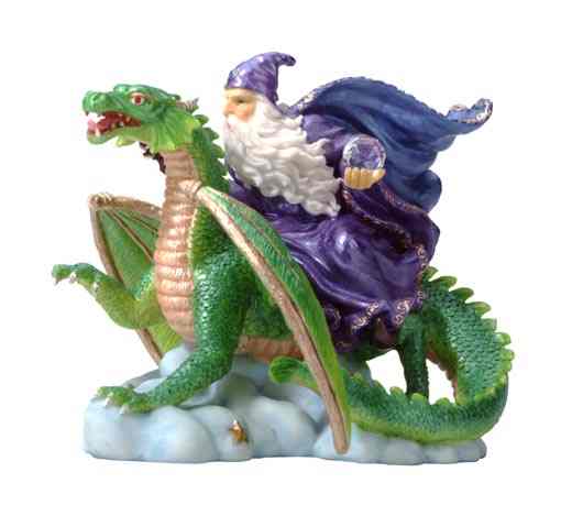 Closely watched by a magnificent green dragon. Merlin peers into a crystal-like ball in order to foretell the future. 5 1/4" x 4 1/2" x 5 1/4" high.#30804 $15.00