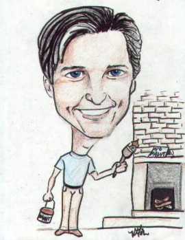 Hi! this is my drawing of Doug. I have him holding a paint brush here, even though there is a NO PAINT sign on the fireplace left by the homeowners. And of course i put him in a BLUE shirt, what else? :) ( note: i know doug didnt paint this fireplace, i know he covered it, but just for the sake of ART , forgive me:)