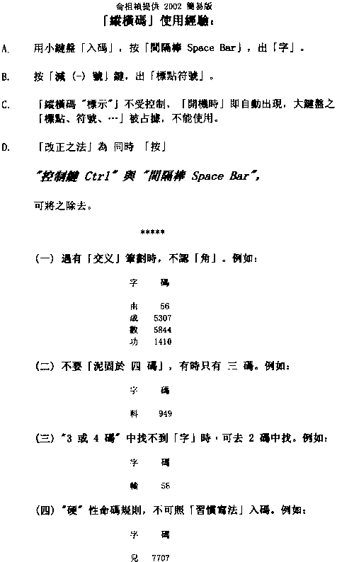 俞祖禎提供 2002 簡易版 「縱橫碼」使用經驗:A. 用小鍵盤「入碼」,四個「角」,照 Z 順序。B, 按「間隔棒 Space Bar」,出「字」。C. 按「減 (-) 號」鍵,出「標點符號」。