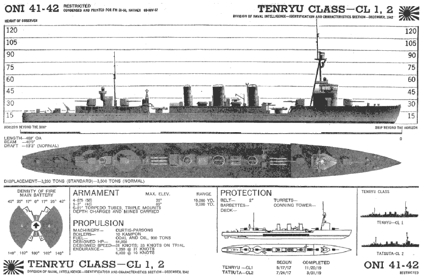 The Tenryû class light cruisers were essentially enlarged destroyers, inspired by and designed with a similar concept to the Royal Navy Arethusa class and C-class cruisers. These were the first ships in the Japanese navy to be armed with triple torpedo tubes. These ships were designed to act as flagships for destroyer flotillas.
