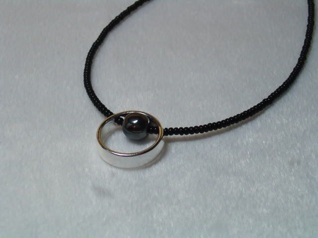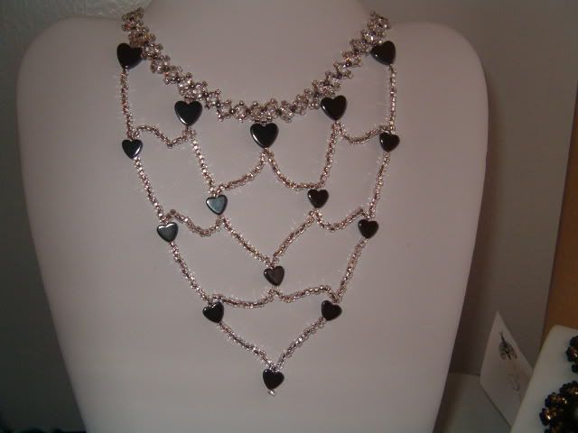 Necklace – satin ribbon tie – silver lined glass bead net meets with hematite hearts at junctions