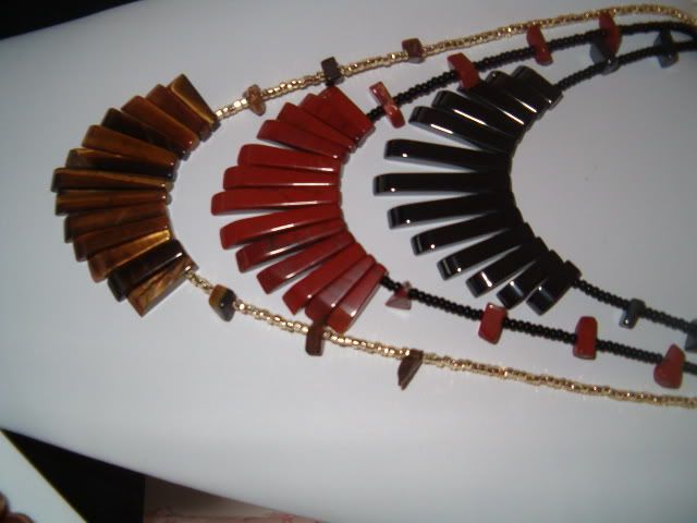 Gemstone fan necklaces – Tigers Eye, Red Jasper, and Hematite shown also available in Amethyst, Turquoise, Sodalite, and Unikite. Rose Quartz.