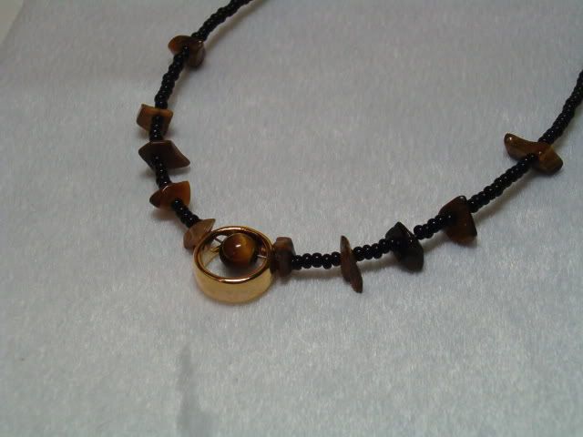Tigers eye center bead in gold colored circle with tiger’s eye chips and black beads.