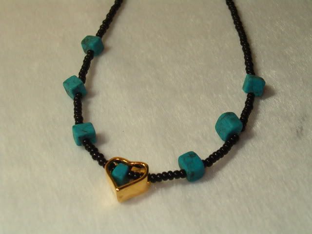 Turquioise bead in center of gold colored heart with turquoise colored chips in black beads