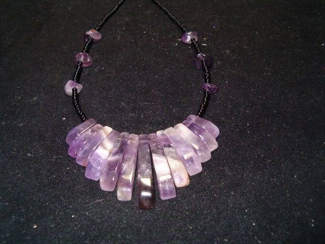 Amethyst Fan necklace with amethyst chips and black seed beads. 17” in length. Standard Clasp.