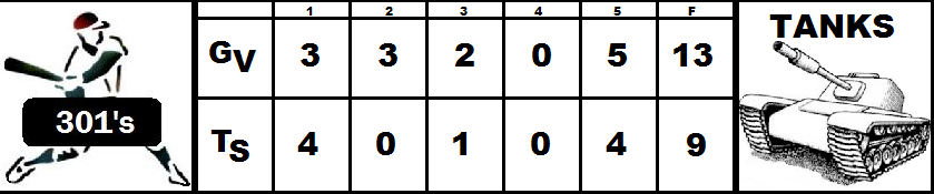 In the fourth, the teams traded zeros, sending the game to the final inning with the Tanks still within striking distance. The 301's, however, realized the importance of insurance runs when playing as the visiting team, adding five runs in their last at-bat. Right fielder Zach Miller layed down two bunts to reach base preceding Kotsovos homeruns. In the bottom of the fifth, the Tanks executed the same tactic, as Stone reached on a bunt. Josh Williams made things interesting late, pushing across four runs with two homers to cut the deficit to just four runs at 13-9. The Tanks hopes ended with a strikeout to Paslack, however, as the 301's captured Game 1.
