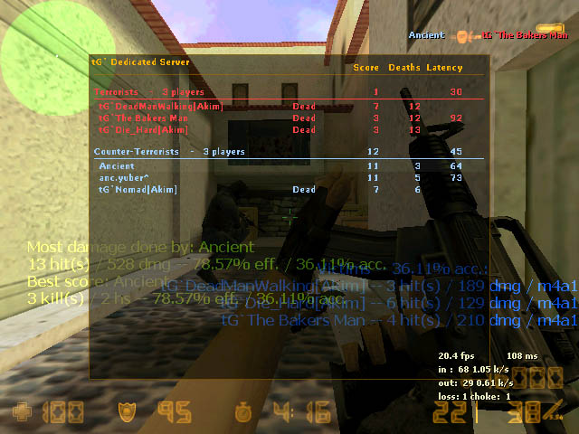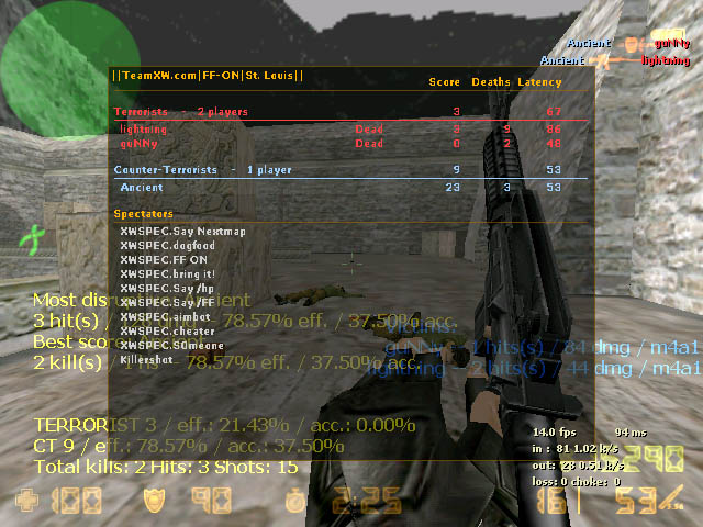 03/07/04 12 shots = 12 hits for 3 kills / 2 hs (481 dmg). 140 / 160hp left