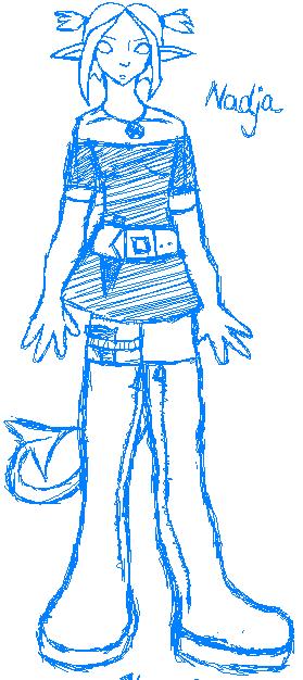 A character I created while scribbling in Paint for an hour or something... Paint's evil... anyway, she might be part of a long, complex and death-filled X-Men fanfic that I guess is loosely inspired by having watched all three Terminator movies in the space of a week. I hate the icky colours the jpeg made her go, she was pretty blue before I had to convert it. If I was the sort of person who coloured things, she'd have blue skin (Kurt/Mystique colour... ish), yellow eyes, indigo hair with white streaks at the front, and... I never thought about the rest. This is a cruddy thumbnail, btw. It looks better if... well, it looks better if you look at the real thing.