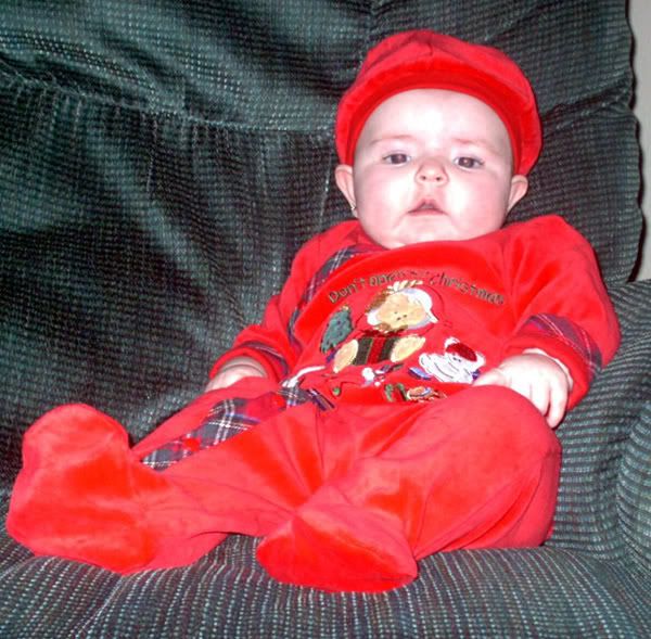 Wearing another Christmas outfit. It says: Don't open till Christmas