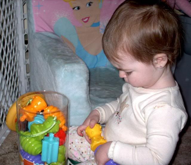 Being a typical kid and playing with the basket instead of the toys!