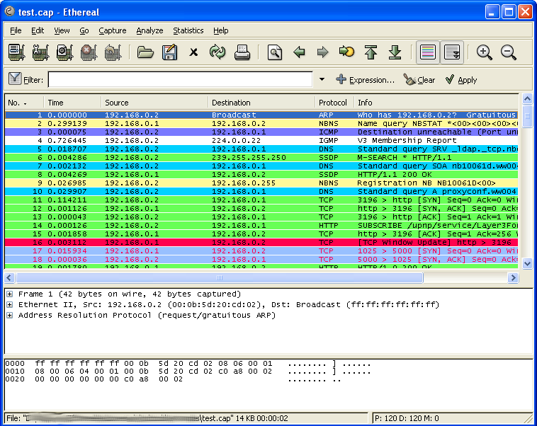 5. The Ethereal menu sits on top of the Ethereal window. The main toolbar provides quick access to frequently used items from the menu. This toolbar cannot be customized by the user, but it can be hidden using the View menu, if the space on the screen is needed to show even more packet data. The filter toolbar lets you quickly edit and apply display filters. The packet list pane displays all the packets in the current capture file. The packet details pane shows the current packet (selected in the "Packet List" pane) in a more detailed form. The packet bytes pane shows the data of the current packet (selected in the "Packet List" pane) in a hexdump style. The statusbar displays informational messages. In general, the left side will show context related information, while the right side will show the current number of packets.