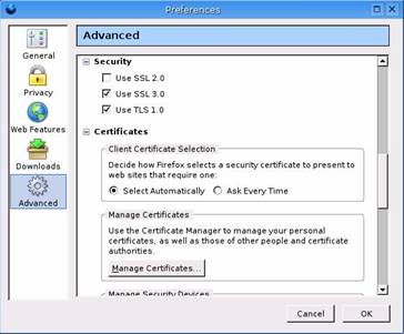 Then we moved on to web browser security and configuration. Here are a couple of screenshots that were taken from Firefox’s advance security preferences tab. Some of these settings should be adjusted depending on the situation.