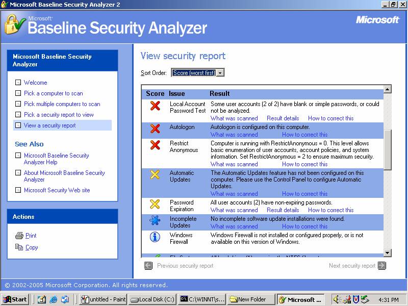 Then we installed and ran the MBSA to baseline our system and to determine what other measures to take to harden are system even more. Here is a screen shot of the results and this link will take you to a report of the results.