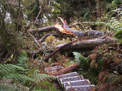 After the bridge, the track veered uphill steeply back into the bush. The climb reached a track junction after about fifty minutes. This would take us on the last section of the day's walk to Port William hut whereas the other turning at the junction was for the six hour tramp to North Arm Hut - the next day's walk.