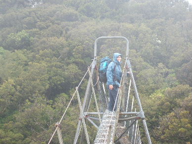 At the end of Maori Beach, a rickety wire swing bridge spanned a small river estuary. The wind blew in gusts down the river valley, making crossing treacherous. The fifty-yard span was only capable of taking one person at a time, so traversing the bridge took a while.