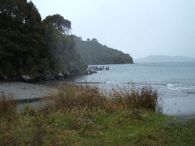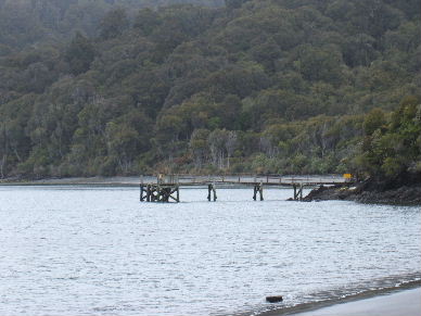 | A picture taken from Port William Hut showing the jetty. During our visit, the jetty was closed as it required repairs. I guess that its hardly used these days, but when Port William was a little settlement rather than a remote hut, it was probably better used. |