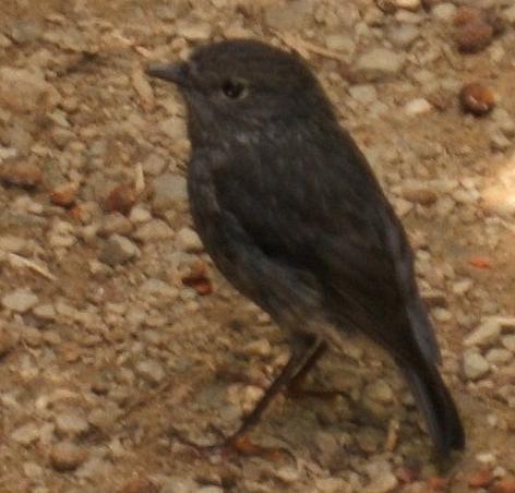 | This little chap was one of the first birds that we were able to get close enough to picture. This is a North Island Robin, very similar to the UK Robin, but much darker and with a white rather than a red breast. This Robin is just as naturally inquisitive as its British cousin and got extremely close. |
