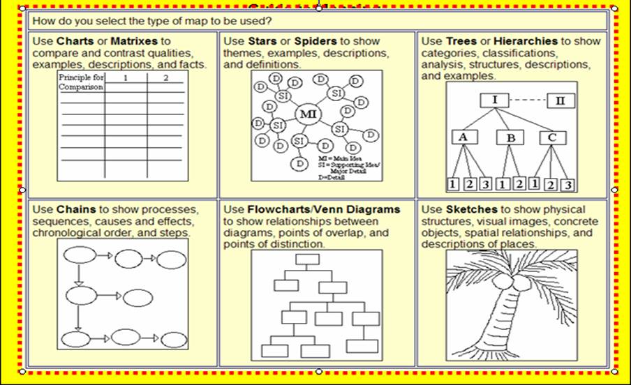 Mapping is a process of reorganizing and rearranging (moving) the most important ideas and information from your reading or textbook and converting it into a diagram with your own words to help you understand and remember what you read. Because mapping makes it easier to organize and remember what you have read, mapping is a useful studying technique. Moreover, mapping can help you organize your own writing when used as a pre-writing technique.