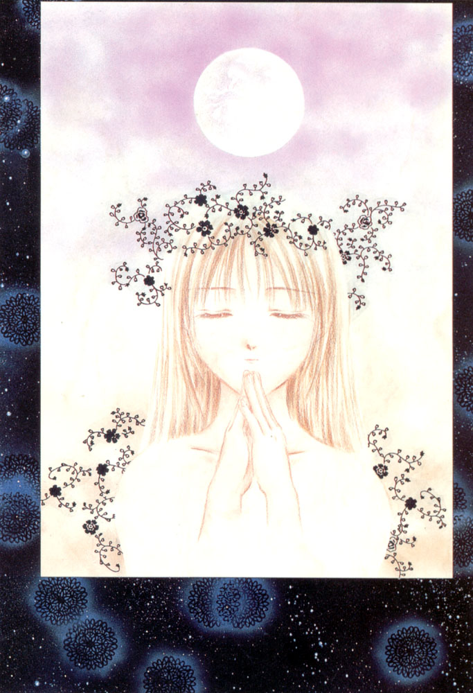Aya (with a wreath-like thing on her head and a moon in the background)