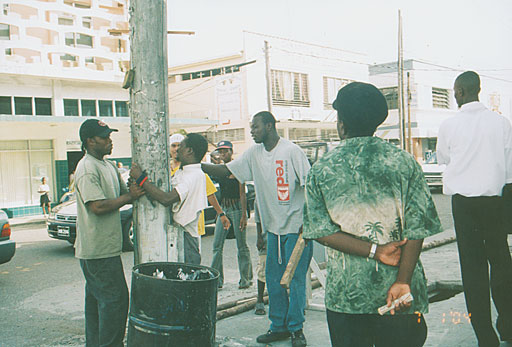 This unfortunate car trunker was caught red-handed trying to steal parts of a car which was parked between Camp and Charlotte Streets on Thursday afternoon. He was tied to a utility pole and beaten by the irate owner of the vehicle, as several onlookers watched. He was later taken to the Police Station.