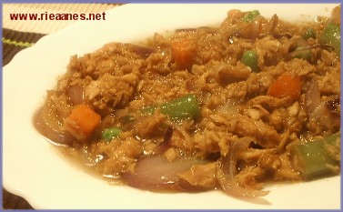 2. Add tuna, mixed vegetables, garlic and ginger powder. Stir fry for 1 minute.