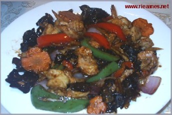 1. Heat oil in a pan, saute garlic, then add shrimps, ginger and black fungus. Stir fry until shrimps change its color.