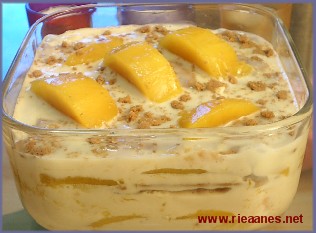 2. In a clear dish, arrange 1 layer of soda/graham crackers at the buttom. Add few slices of mango above the crackers, then pour few amount of cream mixture on it. Cover again with the crackers and repeat procedure until all the ingredients are done. Making the cream as the last layer.