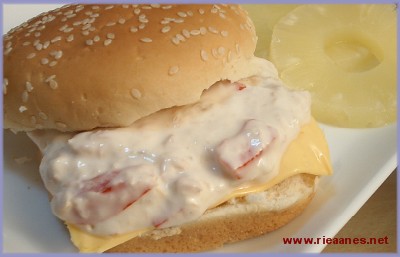 2. Put cheddar cheese on each inner side of buns, spread enough amount of pineapple-tuna mixture above the cheese, cover it with another half of the buns.