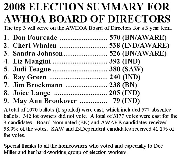 ELECTION RESULTS 1. Ernie Shoults ......................... 492 (IND) 2. Irv St. John .......................... 473 (BN) 3. Bing Miller ........................... 463 (BN) 4. Harry Lipert .......................... 435 (BN) 5. Walt Stromme .......................... 419 (SAW) 6. Judi Teague ........................... 419 (SAW) 7. Jan Cristo ............................ 120 (IND) A total of 979 ballots (2 spoiled) were cast, which included 184 absentee ballots. 2821 votes were cast for the 7 candidates. Board Nominated candidates received 48.6% of the vote while SAW and INDependent candidates collectively received 51.4% of the vote. This was reported by election officials to be the largest turnout for an election in the history of Apache Wells. Special thanks to all who voted and to Dee Miller and her great group of election workers. December 31, 2006 A Community Divided! Members of the AWHOA Board of Directors, the Community Long Range Planning Committee and some homowners have attributed the division of the Apache Wells Community to the radical Save Apache Wells Committee, also referred to by some as "those SAW people". This is true since on one side of the divide are the homeowners who want all homeowners to shoulder the replacement of the Country Club building with an new $8,500,000 building and assess each homeowner approximately $6000 and on the other side of the divide are the homeowners who do not want, will not use or cannot afford this project. As with most issues in a democracy, there are at least 2 sides and the outcome is decided by a vote. Would we want it any other way? We sincerely hope, that as in the past, when the issue of the Community Center Project has been settled, we can all get back to enjoying our wonderful little community in the desert and once again work together. WORDS OF WISDOM: During the 2006 Arizona State Election Campaign, the candidates for the state legislature were asked to list the best bit of political advice they have ever received. Here is one that is noteworthy given the opposing views of the S.A.W. Committee and the AWHOA Board of Directors, AWCC and the LRPC. "Don't take anything personally. Many people will disagree with you and your ideas and vice versa, but that's what democracy is all about."