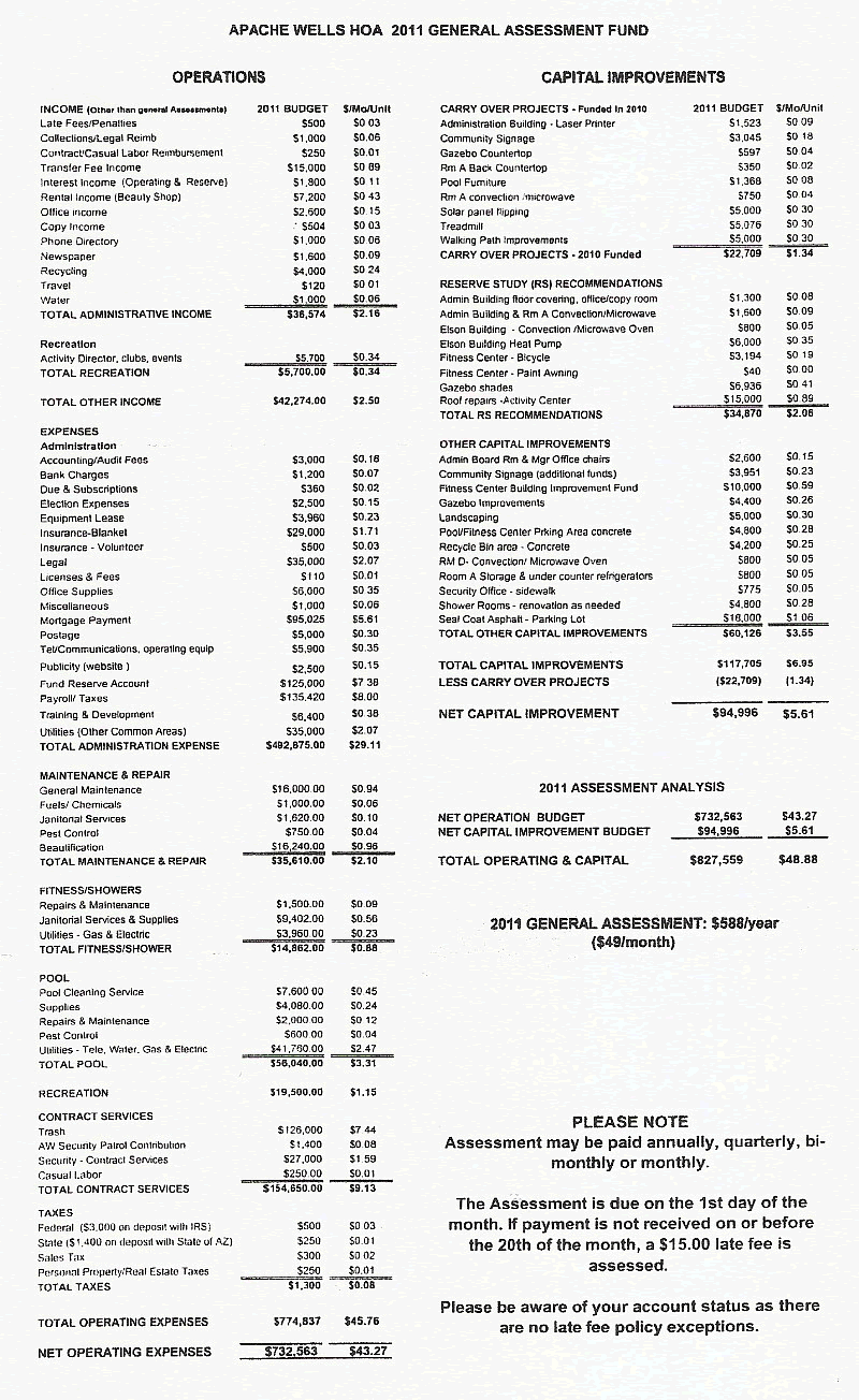 YES ......... 635 The AWHOA Board of Directors sponsored Bylaw Change initiative was approved today. There were 864 ballots cast. The 2/3 majority needed for passage was exceded by 59 votes. The Bylaw change will allow a home buyer to have the option of taking over the monthly special assessment payments of the home seller. April 10, 2007 Little News at April Homeowners Meeting! Thursday's homeowners' meeting in Apache Hall turned out to not be another standing room only event. The number of homeowners in attendance was noticeably down and was evidence that the annual spring exodus from Apace Wells was well underway. The call to order by Board President Marv Stoll at 7PM sharp was followed by the usual opening rituals: introduction of the Board members, reading of the March minutes by Secretary Linda Wood and the always entertaining committee reports. The hot topics included the fact that the pool had to be closed for a day last month due to visitors over-using the suntan lotion and under-using the showers prior to taking their dip, producing a disconcerting murkiness to the normally crystal clear pool water. An incident involving broken glass in the pool was also discussed at length with the topic resurfacing during the open forum when a homeowner questioned whether our Bylaws could force the guilty party to pay for the cleanup. The culprit apparently evaded the video surveillance camera and remains at large. Tom Finger reported that some well-to-do vandals had "soaped" the Apache Wells fountain recently with nearly $200 worth of liquid soap. The only Old Business featured a replay of the information and procedures for the April 12th Bylaw Change Election. In-person voting 9AM-5PM in Room A and don't forget your photo ID. Under New Business, President Marv Stool reminded residents that the collection of the $6020 Special Assessment and the start of the Community Center Building Project were currently ON HOLD because of a law suit filed by some homeowners. He indicated that because of the law suit he could not comment on the current status other than to say that the Board was meeting with their attorneys. He announced that homeowners who had paid their Special Assessment before THE HOLD will have their checks returned.