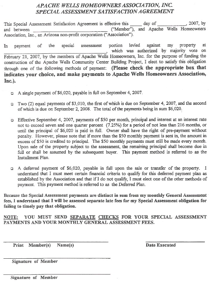 April 2, 2007 DO NOT Pay the Special Assessment! The following is the text of a letter mailed to all Apache Wells Homeowners on March 26, 2007 by the AWHOA Board of Directors after being advised by their attorneys to "stand down" and put the collection of the special assessment for the Community Center Building Project ON HOLD until further notice.