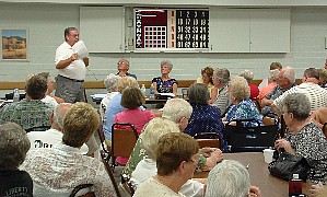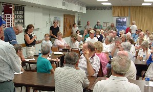 Chairman Walt Stromme addresses the overflow crowd eager to hear of SAW's plan to challenge the recent vote and stop the building project. Legal counsel has been retained and fund raising is under way.